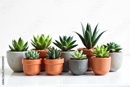 A collection of various succulent plants in ceramic and terracotta pots arranged against a white background.