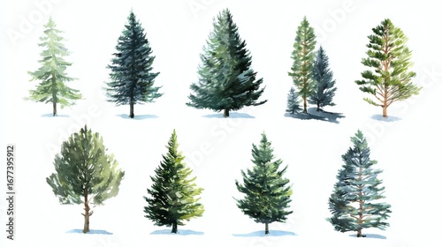 A collection of various watercolor-style trees, showcasing different shapes and colors, set against a light background