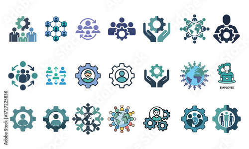 A collection of vector icons representing teamwork, employees, global collaboration, workforce management, leadership, and organizational efficiency with gear and network concepts.