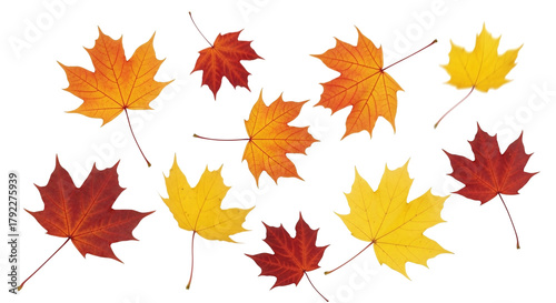 A collection of vibrant autumn maple leaves in shades of red, orange, and yellow, scattered on a clean white background, showcasing the beauty of fall foliage.