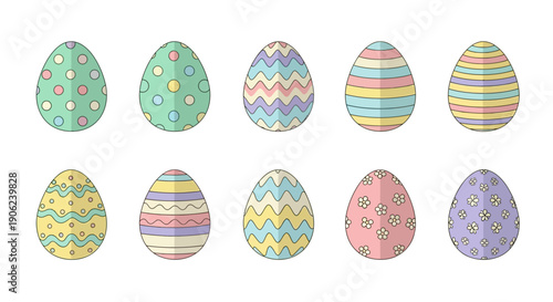 A collection of vibrantly decorated Easter eggs, each with unique patterns and pastel colors, perfect for spring celebrations and holiday designs