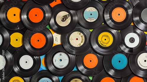 a collection of vinyl records neatly arranged with their colorful and varied spines visible