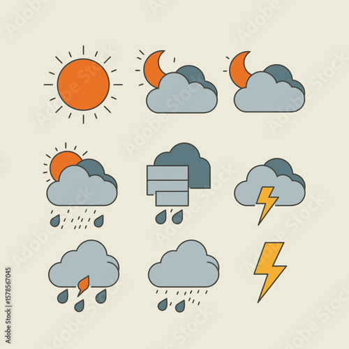 A collection of weather icons, including the sun, moon, clouds, rain, and lightning, designed in a simple and modern flat style against a neutral background.