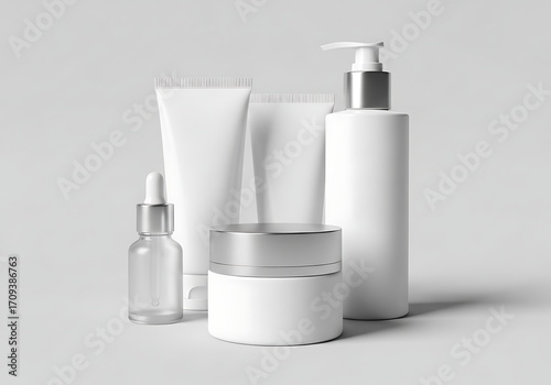 cosmetic, beauty, skincare, product, bottle, jar, cream, lotion, serum, dispenser, tube, container, cardboard box, silver, clean, minimalist, studio, shot, group, set, hygiene, wellness, treatment, moisturiser, face, body, care, luxury, premium, brand, design, empty, blank, template, object, still, life, white, plastic