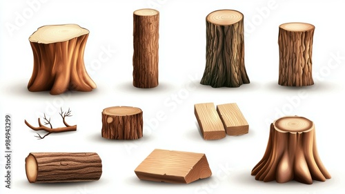 A collection of wood pieces, including logs, branches, and tree trunks