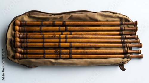 A collection of wooden walking sticks neatly arranged in a carrying case.