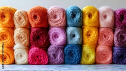 A collection of wool rolls in gradient rainbow colors arranged symmetrically on a marble table, soft natural light highlighting the intricate fibers, hd quality, artistic and serene. --ar 16:9
