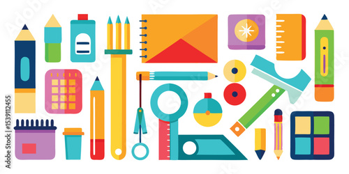 A colorful and playful illustration set featuring a variety of school and art supplies perfect for enhancing educational and creative design projects
