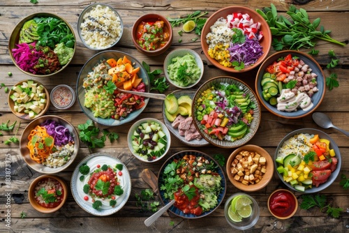 vegan, vegetarian, bowl, salad, food, healthy, fresh, ingredient, vegetable, fruit, grain, avocado, tomatoes, cucumber, red, cabbage, cilantro, parsley, lime, wooden, table, rustic, natural, organic, eating, lifestyle, delicious, vibrant, colourful, arrangement, flat, lay, top, view, overhead, commercial, kitchen, dining