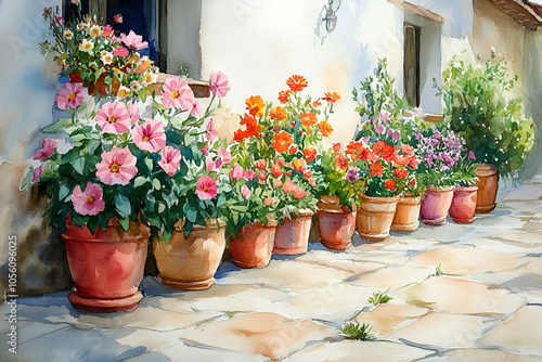 flower, pot, garden, plant, colourful, serene, calmness, greenery, lovely, peaceful, vibrant, path, bloom, aesthetic, artistic, patio, sunlight, flower petals, soothing, rustic, horticulture, blossom, scenic, blooming, charming, terrace, arrangement, art, floral, cheerful, outdoors, design, texture, clay, decor, beauty, flora, nature, bright, environment, plant, summer, brick, landscape
