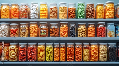 snack, jar, food, colourful, candy, treat, delicious, sweet, savoury, variety, glasses, container, arrangement, shelf, organised, kitchen, pantry, grocery, store, market, assorted, appetising, tasty, deliciously, munchy, crisp, biscuit, cracker, chips, nut, seed, grain, bean, legume, dried, fruit, vegetable
