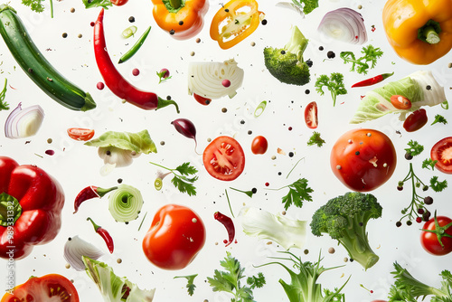 A colorful assortment of vegetables and herbs are scattered throughout the image