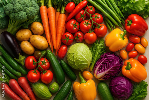 A colorful assortment of vegetables including tomatoes, carrots, broccoli, and peppers. Concept of abundance and freshness, showcasing the variety of healthy foods available