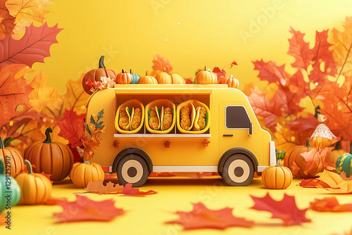 A colorful, autumn-themed food truck with tacos surrounded by pumpkins and fall leaves in a festive, cozy atmosphere.