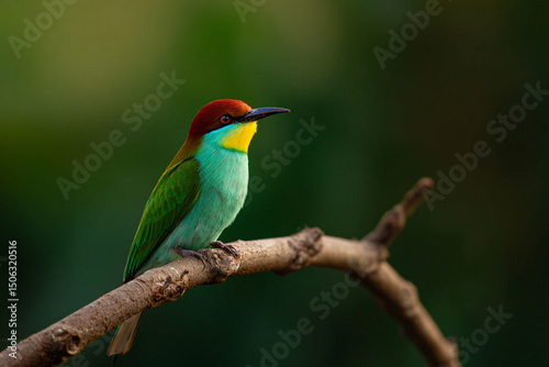 bird, tree branch, nature, colourful, vibrant, bee-eater, closeup, perched, half face, redhead, blue eye, blurred background, vivid colors, composition