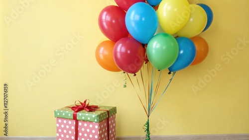 A Colorful Bouquet of Balloons and a Polka Dot Gift Box Rest Against a Yellow Wall