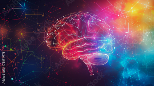 A colorful brain with a lot of lines and dots surrounding it. The brain is surrounded by a lot of lines and dots, which gives the image a very abstract and futuristic feel