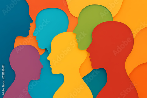 shape, head, colourful, collage, people, idea, oneness, diversity, different, talk, way, paper, silhouette, business, illustration, group, symbol, vector, concept, woman, human, speech, face, background, profile, community, team, crowd, dialogue, social, portrait, abstract, population, discussion, speak, adult, young, conversation, connection, design, audience, female, modern, teamwork, psychology, meeting, age, multicultural