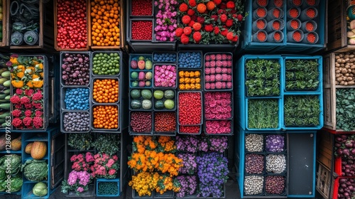 fruit, berry, vegetable, flower, produce, market, crate, display, colourful, fresh, food, red, orange, green, blue, purple, yellow, tomatoes, greener, apple, pear, melon, radish, onion, spinach, basil, carrot, cauliflower, potato, peach, plum, grape, squash, mandarin orange, bloom, blossom, harvest, abundance, variety, healthy, organic, wholesome, seasonal, selection, farm, shop