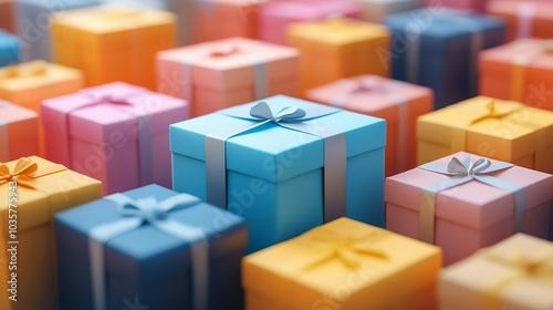 A colorful display of gift boxes stacked together, showcasing vibrant hues and decorative ribbons.
