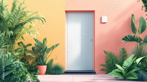A colorful flat house design with a front garden, simple lines, and bright greenery, minimal style.