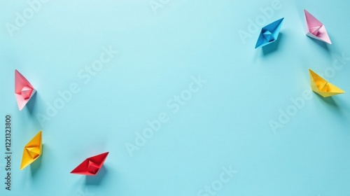 A Colorful Fleet of Handmade Paper Boats Sailing on a Serene Light Blue Background
