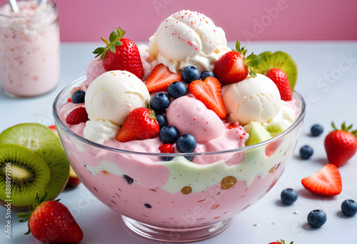 A colorful fruit salad with strawberries, blueberries, and scoops of white ice cream or frozen yogurt in a glass bowl