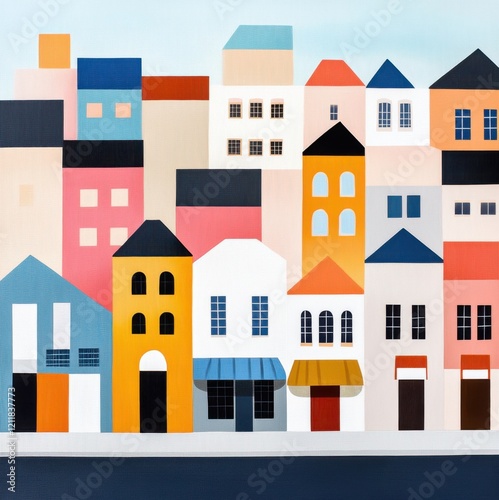 art, building, urban, colourful, geometric, visual, shape, unique, imagination, harmony, playful, residential, line, form, community, vibrant, detail, vignetting, artwork, contemporary, aesthetic, graphic, window, representation, scene, village, quaint, house, composition, craftsmanship, street, painted, charming, artful, modern, town, roof, style, design, texture, pattern, creative, decor, facades, colours, bright, architecture, city landscape, landscape