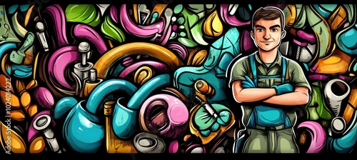 A colorful illustration featuring a person surrounded by vibrant abstract shapes and tools.