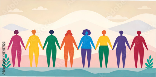A colorful illustration of diverse women standing together, holding hands, symbolizing unity, support, and empowerment in a vibrant landscape.