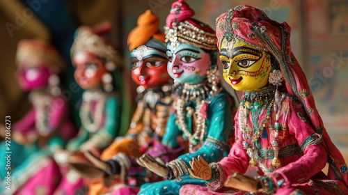 A colorful Indian puppet show with traditional Rajasthani puppets in action.