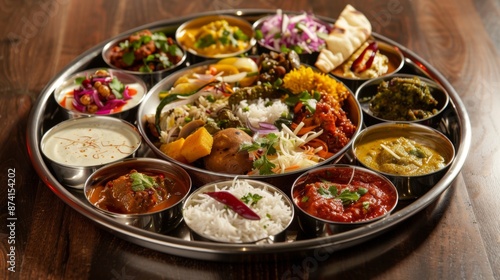 A colorful Indian thali with a variety of curries, rice, bread, and chutneys served on a metal platter.