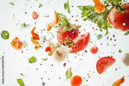 A colorful mix of tomatoes, bell peppers, and leafy greens suspended in mid-air
