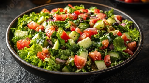 A colorful mosaic of crisp lettuce, vibrant tomatoes, and crunchy cucumber, seasoned with a light vinaigrette, offering a healthy and refreshing delight.