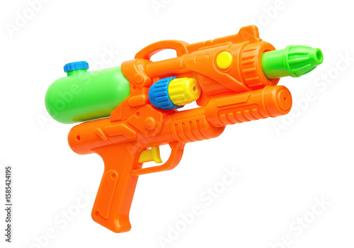 A colorful orange and green water gun toy, ready for summer fun, isolated on a transparent background