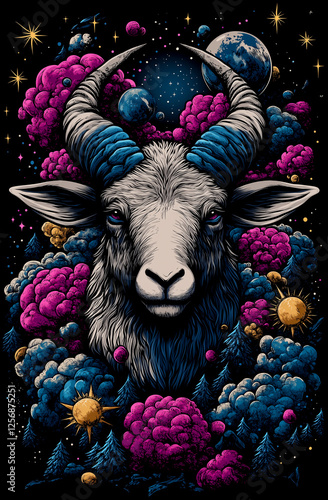 colourful, painting, goat, blue, horn, purple, flower, fantastical, animal, cloud, impression, head, tree, sheep, giving, jampacked, wild, wildlife, symbol, mammal, illustration, aries, nature, design, drawing, vintage, tattoo, domestic, astrology, male, signs, graphic, hand, black, white, background, vignetting, emblem, fauna, icon, zodiac, horoscope, mascot, fur, drawn, farm, retro, mountain