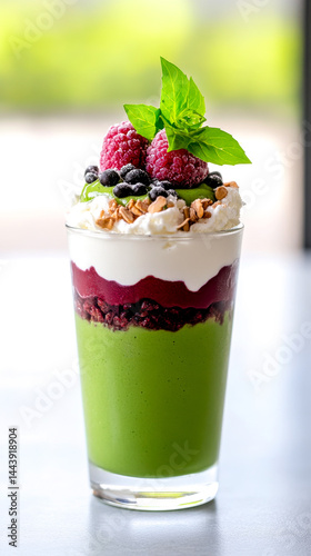 matcha, parfait, dessert, raspberry, granola, fancy, vibrant, stylish, refreshing, artistic, cool, refreshment, vitamin, elegant, treat, fusion, vegetarian, nourishment, indulgence, wholesome, snack, dairy, layered, culinary, cream, plated, yogurt, modern, whipped, smoothie, mint, topping, antioxidant, red, basil, healthy, epicure, glasses, appetising, berry, green, fruit, sweet, natural, fresh, cold, organic