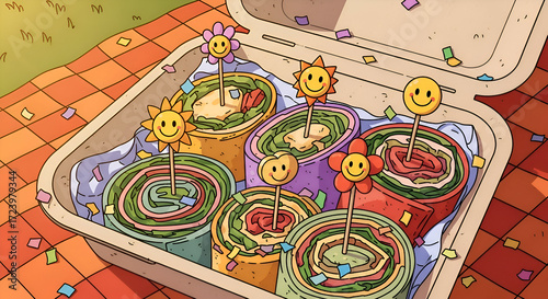 picnic, cheerful, lunch, box, food, cartoon, enclosed, happy, smile, colourful, fun, celebration, joy, eat, fresh, creative, playful, vibrant, delicious, detail, illustrated, animation, charming, design, artwork, cute, appetising, joyful, party, outdoors, spring, meal, sandwich, vegetarian, tasty, pattern, decorative
