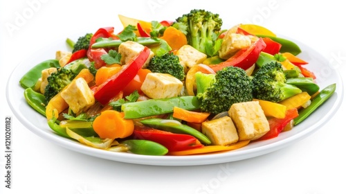 colourful, plate, vegetable, stir fry, bell, pepper, broccoli, carrot, snap, pea, tofu, each, vibrant, colours, crisp, texture, captured, precision, set, isolated, white, background, highlight, freshness