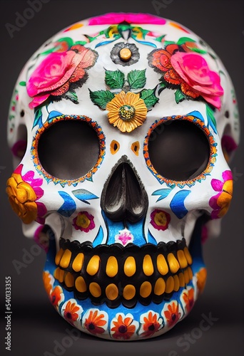 A colorful portrait of a skull and flowers for "dia de los muertos", "Day of the dead" calavera 3d illustration.