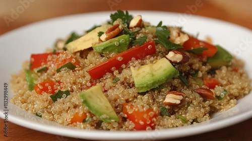 A colorful quinoa salad with vegetables and nuts, served in a white bowl.