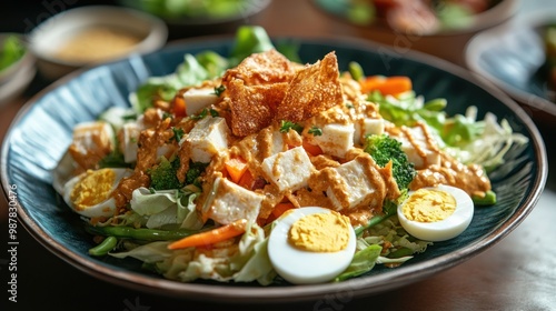 salad, tofu, vegetable, egg, broccoli, carrot, dressing, healthy, meal, cookery, fresh, colourful, garnish, nutrient, bowl, lunch, dinner, snack, protein, green, herb, crunchy, creamy, delicious, appetising, organic, vibrant, alimentary, culinary, ingredient, favor, texture, presentation, food, dining, vegetarian, wholesome, epicure, asian, crispy, plate, receipe, seasonal, local, homemade, variety, balance
