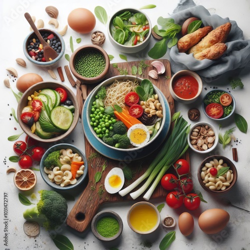 A colorful set of vegetables and food arranged on a table, showcasing a healthy and delicious meal with fresh ingredients for a gourmet dinner