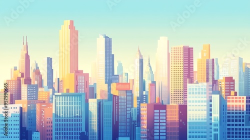 city landscape, city, building, urban, sky, skyscraper, architecture, downtown, metropolis, horizon, glasses, window, concrete, steel, modern, urbanism, development, facades, structure, tower, view, panoramic, perspective, design, business, commercial, office, residential, sunlight, bright, colours, vibrant, abstract, geometric, shape, illustration, art, graphic, digital, style, cartoon, flat, minimalist, background