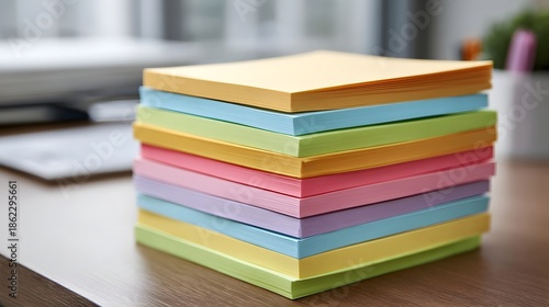 colourful, stack, sticky, note, wooden, desk, yellow, blue, green, orange, pink, purple, pastel, vibrant, paper, stationery, office, supply, pad, sheet, page, memo, adhesive, organisation, planning, reminder, idea, work, study, education, business, creativity, communication, multitask, writing, message, collection, pile, set, workspace, document, item, colours, clean, modern