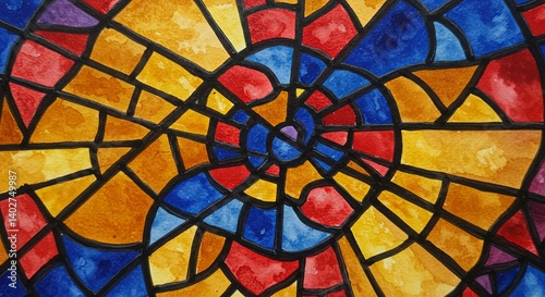 A colorful stained glass window with a spiral design
