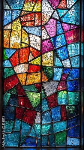 A colorful stained glass window with intricate patterns and vibrant hues.