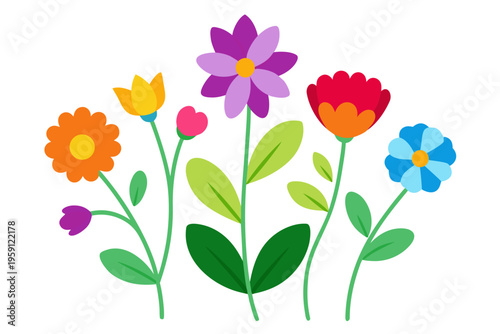 A colorful vector illustration of a bouquet of flowers with green stems and leaves