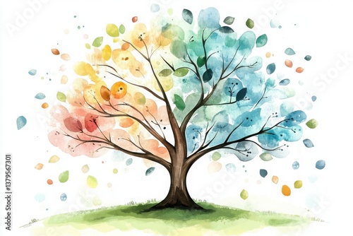 A colorful watercolor tree with vibrant leaves in shades of blue, orange, and green, surrounded by falling leaves, set against a soft grassy background.