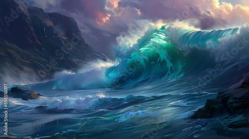 A colossal wave in shades of deep ocean blue and seafoam green, crashing dramatically against towering cliffs at twilight.